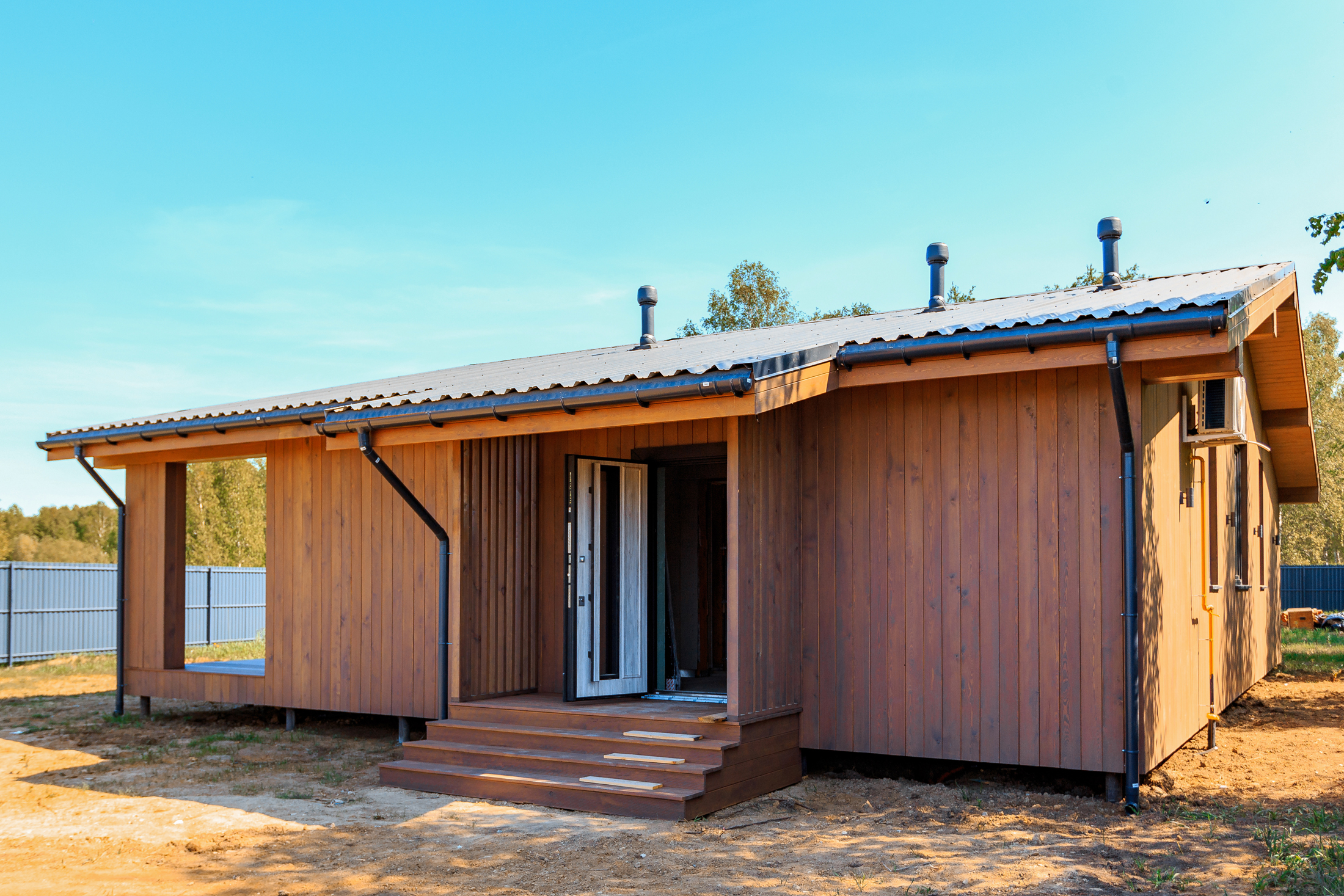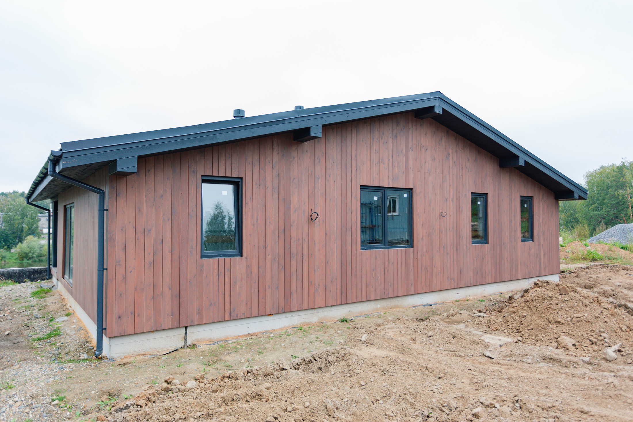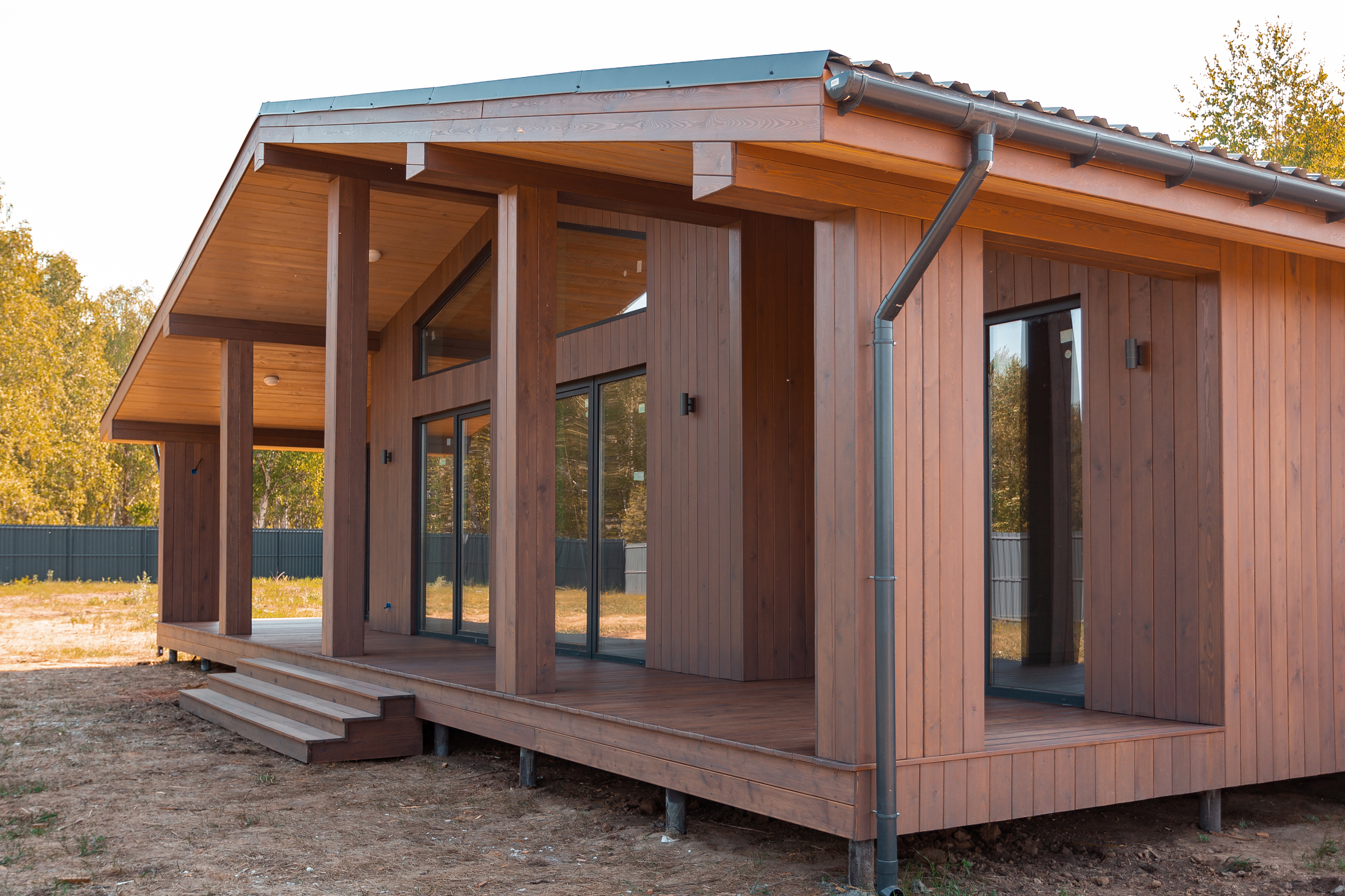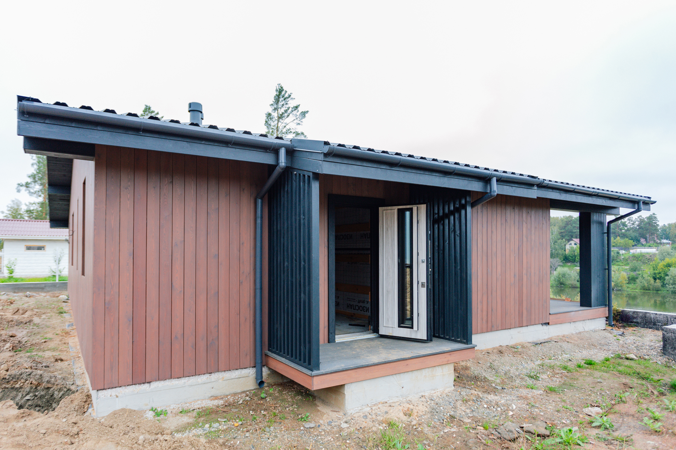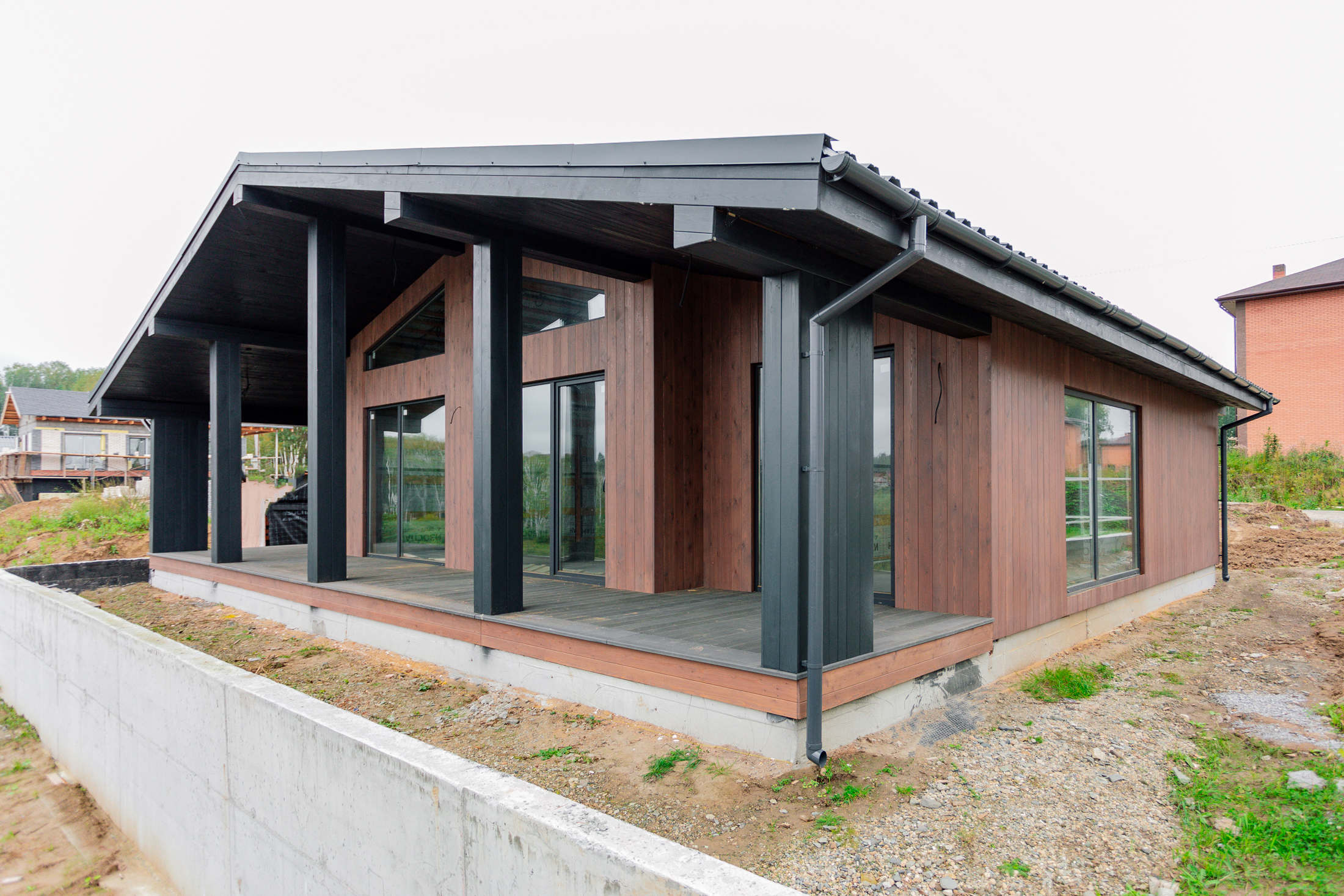 Для наружной отделки домов может применяться широкий спектр материалов и их сочетаний: На этом этапе также выполняется установка окон, входных дверей, настил террас и балконов, монтаж их ограждений, устройство карнизов и монтаж водосточной системы кровли.
